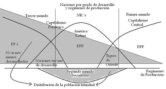 El capitalismo central se compone de las naciones más industrializadas donde domina el RPF. Véase en la parte sombreada la fracción alícuota (ilustrada de manera aproximada), de la distribución mundial de la población y bajo que tipo de capitalismo viven.