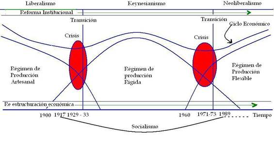 Nótese cómo la articulación y yuxtaposición de las regímenes de producción (reestructuración económica), van dando razón de ser a las crisis juglares del siglo XX, la del 29 y la del 71. Donde se vela el ciclo económico del capitalismo sistémico global y que explican el cambio de ética en la administración pública durante le vigésima centuria donde la transición de un régimen de regulación a otro obedece a la reforma institucional que causan las crisis juglares en razón de que las instituciones y las organizaciones mantengan mayor consistencia y lógica en su permanencia histórica.