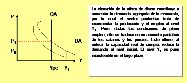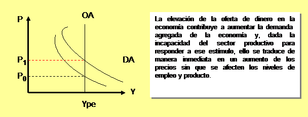 Siguiendo a David Ricardo, el impacto de las variaciones en la cantidad de dinero sobre los precios se transmite de manera directa y sin que se presenten cambios, ni aun a corto plazo, en variables reales como el empleo y el producto. Es decir, la expansión de la oferta de dinero genera una elevación en la demanda agregada de la economía y ello conduce de manera inmediata a una elevación de los precios, ante la incapacidad de la economía para responder a ese estimulo de demanda.