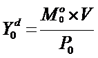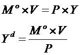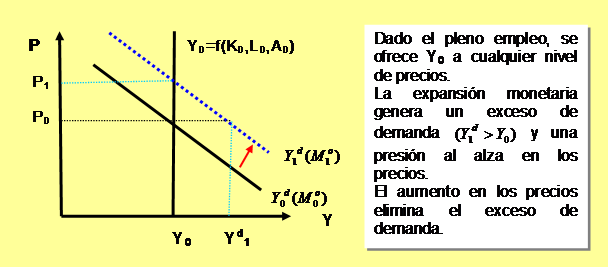 En esta ecuación existe una relación inversa entre la cantidad demanda y los precios. Así mismo, en ella se refleja una teoría implícita de la demanda agregada, pues no se explica cuales son los componentes de la misma. En lugar de ello, la atención está centrada en definir la cantidad requerida de demanda de bienes y servicios (Yd) para que haya equilibrio en el mercado monetario. Finalmente, dado que la velocidad de circulación del dinero se supone constante[48] y los precios se determinan en el mercado (son endógenos) sólo una variación en la cantidad de dinero (Mo) produce cambios exógenos en la demanda agregada.
