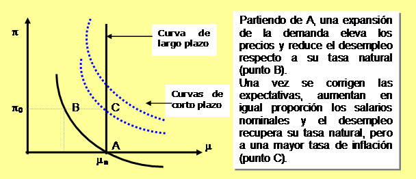 Según lo anterior, la curva de Phillips de corto plazo se desplaza hacia arriba a medida que aumentan las expectativas inflacionarias, con lo cual una misma tasa de desempleo tiende a coexistir con una mayor tasa de inflación.