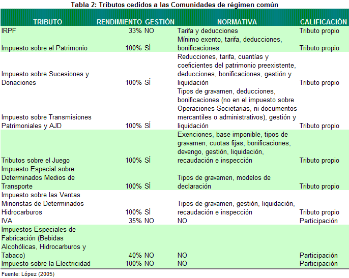 En la actualidad los tributos cedidos a las regiones se pueden ver en la Tabla 2. El nivel central mantiene todas las competencias tributarias en el impuesto sobre sociedades, el impuesto sobre las primas de seguros, la imposición sobre no residentes, los gravámenes a la importación y las cotizaciones a la Seguridad Social.