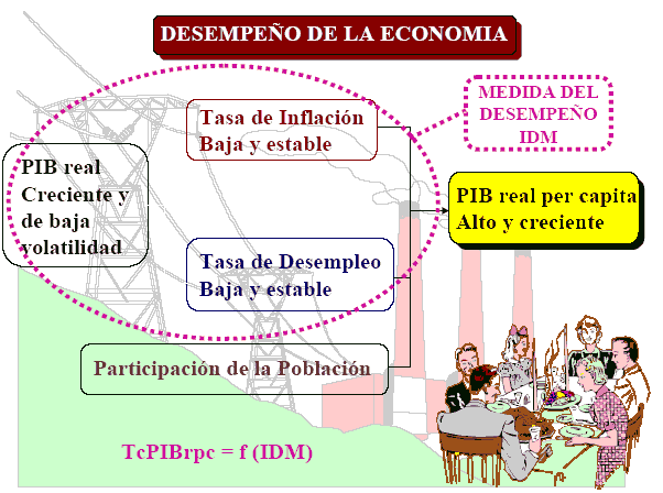El Indice de Desempeño Macroeconómico viene a medir la forma en que la economía en su conjunto enfrenta, mediante la tasa de crecimiento del PIB real, dos de sus problemas fundamentales, como son la inflación y el desempleo. Ahora bien, no solo es importante que la economía presente una tasa de crecimiento del PIB real razonablemente alta y constante en el tiempo, sino que cada individuo lo perciba de esa manera, vale decir, que cada persona sienta que su situación financiera real está mejorando con el paso de los años, lo cual viene reflejado por el comportamiento en el tiempo de su ingreso real per capita. Es así como la economía puede estar creciendo en términos reales y sin embargo las personas en forma individual no lo perciben, porque, aún cuando se produzcan mas bienes la población puede estar creciendo a un ritmo mayor y el resultado es que los incrementos en la producción se dividen entre una población igualmente creciente, con lo cual la situación individual no ha mejorado con respecto al año anterior, siendo que la economía en su conjunto está produciendo mas cantidad física.