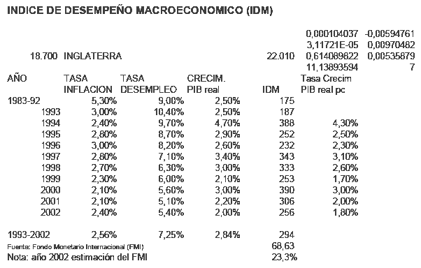En el cuadro siguiente se muestra la aplicación del IDM a la economía venezolana durante el período 1993-2002 así como un promedio para el período 1983-1992. Como se puede apreciar, Venezuela presenta un pobre desempeño macroeconómico en los últimos 10 años (IDM = 20), con el agravante de la gran variabilidad (458%) de su desempeño lo que hace mas difícil la planificación y la implementación de políticas económicas estables en el largo plazo. Pero al mismo tiempo es una economía joven y con gran potencial, por lo que si el programa económico se propone unas metas de: