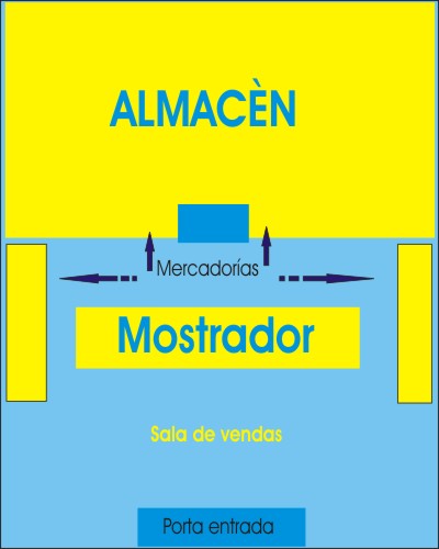 Como se pode observar neste plano, o Almacén dos establecementos que utilizan o sistema de venda tradicional, ocupa máis dun 50% do espacio do local, un 25% o espacio ocupado na zoa do mostrador, e outro 25%, aproximadamente para o que chamariamos a Sala de vendas, lugar onde estan os consumidores e consumidoras esperando a ser atendid@s. |
