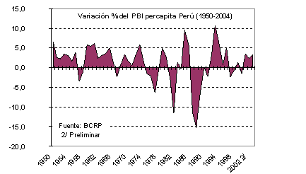 Así, por ejemplo, a pesar de haber disfrutado de periodos como el apogeo de la pesca y de la minería en el Perú, la capacidad relativa de generar rentas endógenas, sin embargo, disminuye ligeramente a lo largo del tiempo, como se pone de manifiesto en las cifras del PBI percápita de fines del siglo XX y comienzos del siglo XXI, comparado con los de la década de los años ´70. Como podemos ver en seguida gráficamente, en la década de los ´70, disfrutábamos como país de una mejor renta per cápita, si compramos con el año 2004; por otro lado la variación porcentual promedio de crecimiento de la renta per cápita anual para los años 1950-2004, ha sido del 1.10%, es donde la tasa de crecimiento de la renta per cápita es altamente inestable debido a que la altas tasas de crecimiento se anulan con las variaciones negativas del mismo, lo que hace que dicha tasa de crecimiento en promedio sea baja. Las tasas positivas promedio de crecimiento de 1950-1965 y 1990-2004 estuvieron asociadas a gobiernos conservadores que dejaron la economía mayormente librada a las fuerzas del mercado; el rezago y luego la reversión del crecimiento económico desde 1965 hasta 1990 estuvieron asociados con formas erráticas de intervención estatal. Pero una generalización de este tipo puede inducir a error, ya que diferentes gobiernos y políticas estuvieron involucrados en cada período, y muchos otros factores entraron en juego. Los factores estructurales particulares más relevantes para la experiencia peruana involucran interacciones entre las características internas y externas (Sheahan, 1994) (2).