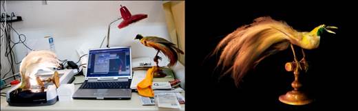 Figura 6. Izq. Proceso de digitalización de un espécimen. Der. pieza final. Luis Castelo. Paradisaea minor. De la serie Historiae naturalis. Escanografía. (110x73 cm). 2009.