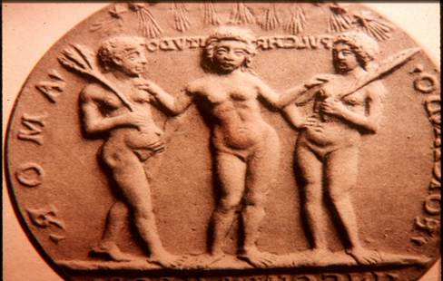 A pesar de sus cantos, sus bailes y su música, los pastores y pastoras de La Diana viven inquietos y sin ilusiones a causa de los tormentos amorosos, y vagan indolentemente en la confusa soledad de su locus amoenus hasta que tres ninfas, Polidora, Cynthia y Dórida, sacerdotisas de la sabia Felicia, les liberan de su existencia errática. Las ninfas forman una tríada cuya significación podría relacionarse con las Tres Gracias como símbolos de Amistad y Concordia. Al mismo tiempo, cada una de las ninfas posee características que la relacionan con una de las Tres Gracias, Castitas, Pulchritudo, Amor, representadas en una medalla hecha por Niccoló Florentino con ocasión de la boda de Giovanna degli Albizzi con Lorenzo Tornabuoni discípulo de Pico della Mirandola (Fig. 15). Fiorentino diseñó también otra medalla en la que representa a las Tres Gracias como Fortitudo, Pulchritudo, y Amor (Fig. 16).