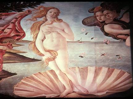 Las ninfas desempeñan un papel muy especial en la obra, como queda subrayado de nuevo, simbólicamente, mediante una referencia explícita al hecho de que se bañan desnudas. Erwin Panofsky nos recuerda que, en el renacimiento, la desnudez estaba “investida de un halo casi metafísico”, y se la asociaba con la Venus del firmamento, que “nos lleva más allá de lo percibido por los sentidos, en contraste con la Venus terrestre, “señora del mundo de la naturaleza, que se percibe mediante los ojos y los oídos”. Botticelli observa esta dicotomía en dos famosos cuadros: El nacimiento de Venus, conocido también como La Venus Anadyomene (Figs. 17), en el que la Venus celeste que surge del mar es empujada hacia la costa en una concha, y La esfera de Venus, conocido como La Primavera (Fig. 18), en el que la Venus terrestre y carnal, bajo una lluvia de rosas, “extiende su dulce imperio sobre la tierra florecida”. En este último cuadro aparecen, de pie, las Tres Gracias, Voluptas, Castitas y Pulchritudo (Figs. 19a, 19b, 20, 21, & 22).