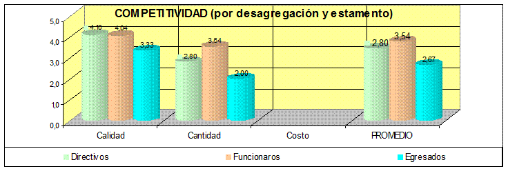 Al desagregar la VAB Competitividad en sus tres componentes, pudo notarse que el menor valor promedio (3,08) correspondió a Cantidad y el mayor (3,47) a Costo. Considerando la media general de esta variable (3,31) pudo observarse que dos de ellos estuvieron por encima y uno de ellos por debajo de la misma.