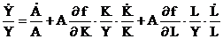 donde el término A(t) de la función representa todos los elementos que influyen en la determinación de Y, además de K (el stock de capital) y L (la cantidad de trabajo).