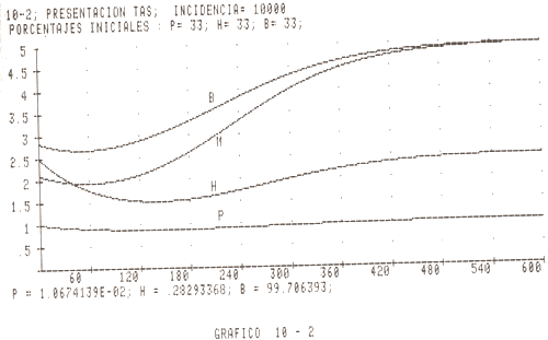 El gráfico 10-2 muestra que el valor del juego o esperanza de la estrategia Burgués es siempre positiva y superior a la de las demás. La evolución de los acontecimientos es aquí también rápida. Obsérvese que los valores hacia los que tienden las esperanzas tras los 600 procesos (E(B) → 5; E(H) → 2,5; E(P) → 1) coincide con el vector de la matriz de pagos correspondiente a la estrategia B. La explicación es que, cuando el porcentaje de empresas Burgués está muy próximo al 100%, para la estimación de E se pondera con gran peso ese vector, Otra diferencia con las tasas de crecimiento observadas en los gráficos del capitulo 8 es que aquí todos los tipos de empresa tienen en todo momento su tasa de crecimiento positiva, La tasa de crecimiento del grupo, H, es lógicamente también siempre positiva.