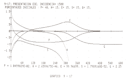 Curiosamente el que los Gallos inicien el juego con mayoría sobre los demás sólo consigue acelerar su desaparición final. En efecto, en los gráficos 9-14 y 9-15, he tenido que utilizar un valor de incidencia de 3000 para que la evolución de los acontecimientos llenase la pantalla. Para valores de incidencia como los utilizados en los gráficos anteriores, hubieran sido suficientes 200 procesos para que las empresas Gato obtuviesen el monopolio de la producción.
